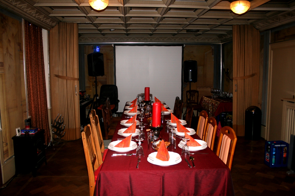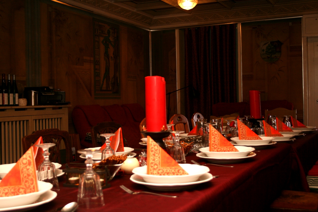Im ersten Obergeschoß besitzt das Haupthaus einen Saal, der über die gesamte Hausbreite reicht. Die Kassettendecke aus Holz und Stuck sowie die mit Leinwand bespannten und bemalten Wände verleihen dem Raum ein ganz besonderes Ambiente.