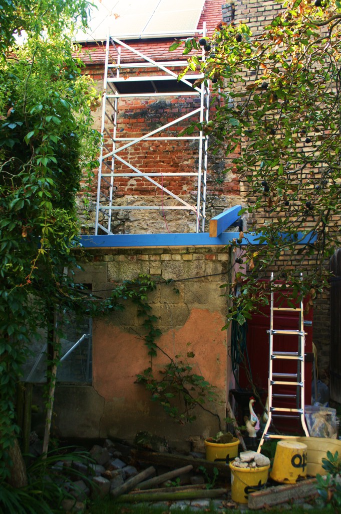 Um die ständige Flutung zu stoppen mußte zunächst eine Dachrinne am angrenzenden Nebengebäude angebracht werden. Wegen der großen Höhe mußte das Gerüst zum Einsatz kommen.