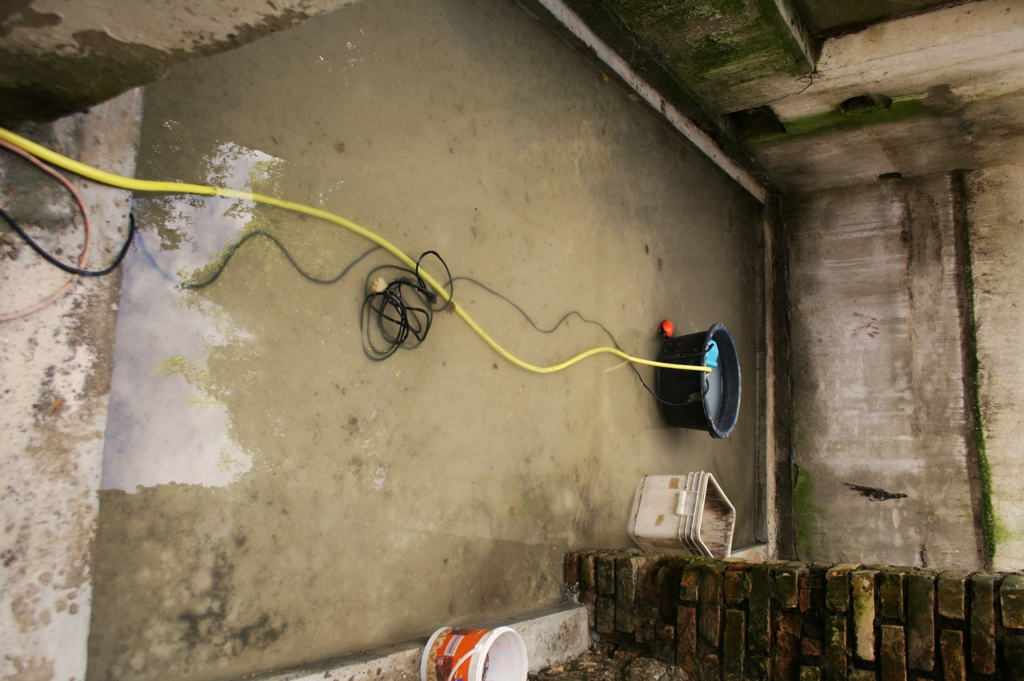 Um das Wasser zu stoppen und eine ebene Fläche für den Aufbau des Gerüsts zu schaffen wurden ca 800kg Beton eingebracht. Am Rand wurde ein Sockel betoniert, um die Wände abzudichten.