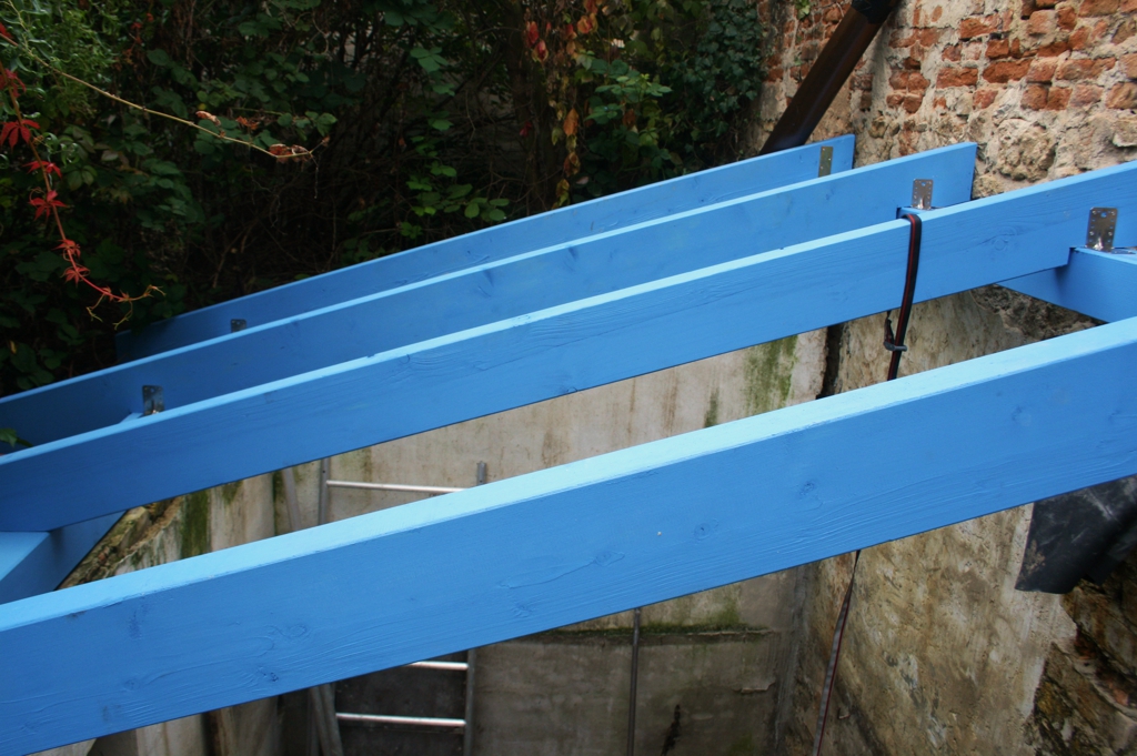 Das Gewicht der Sparren hält sich in Grenzen. Man kann sie alleine nach oben bringen und montieren.