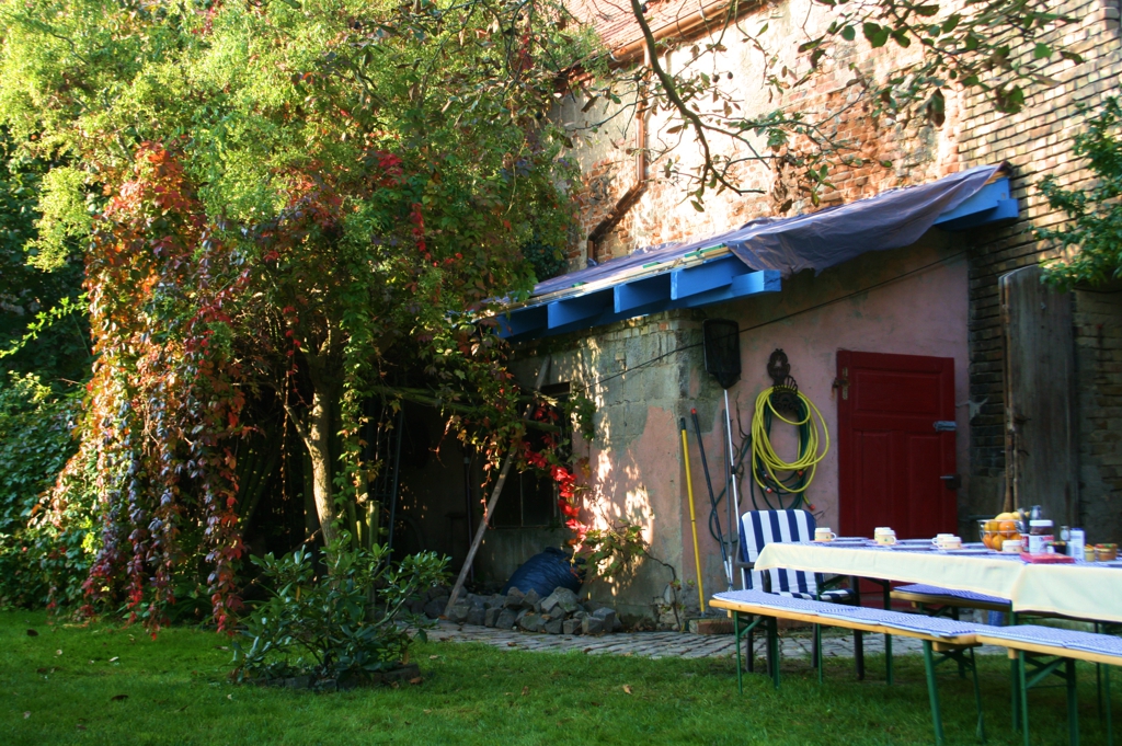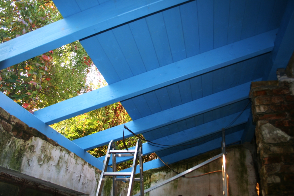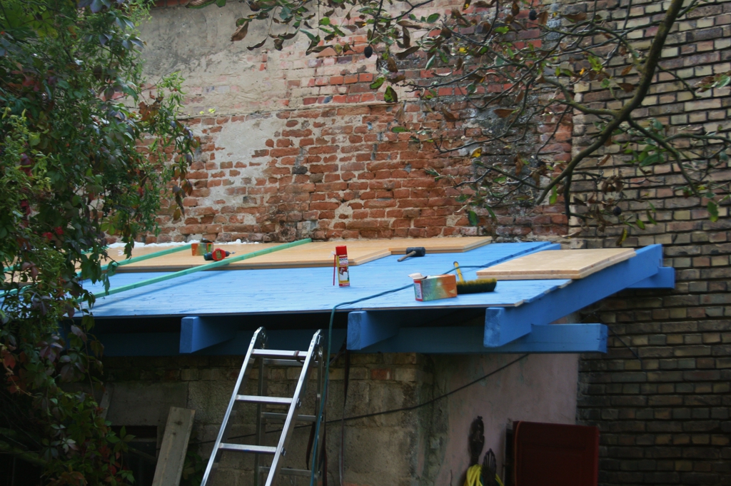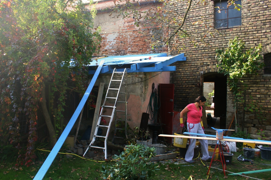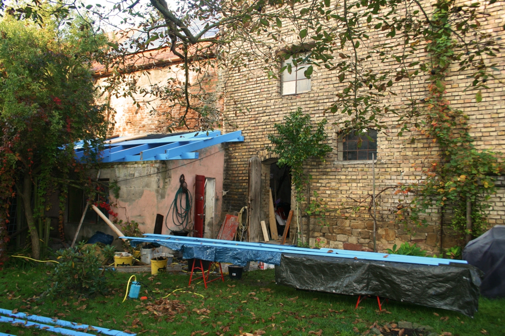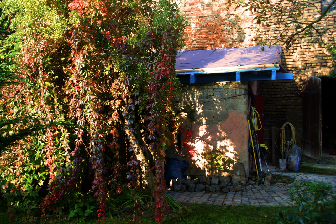 Das Dach darüber hatte keine funktionsfähige Dachrinne mehr, dadurch lief die Hütte bei Regen regelmäßig voll und das Wasser suchte sich seinen Weg in die Wand des Nebengebäudes und in den Keller der Scheune.
