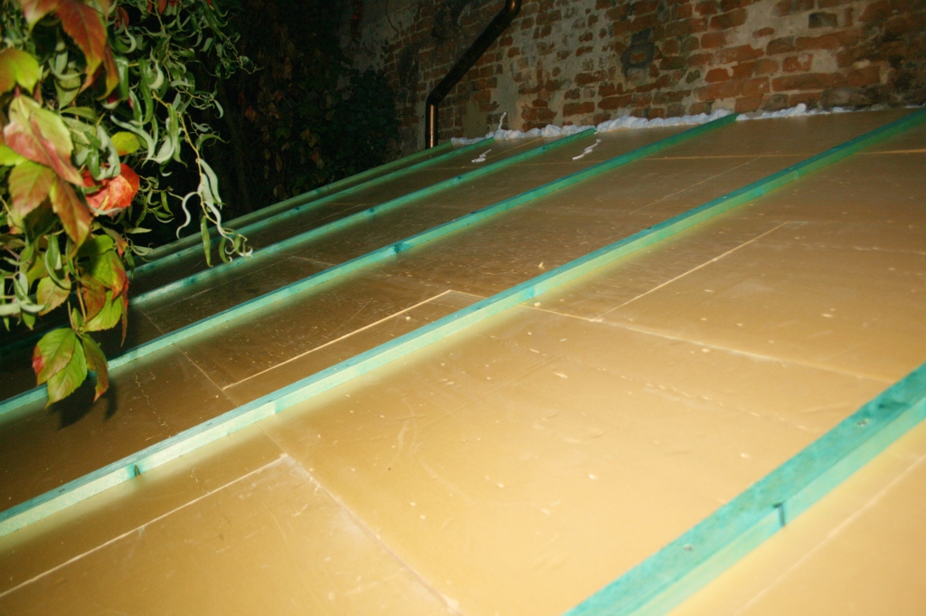 Das Dach wird mit 50mm starken XPS-Platten isoliert. Die XPS-Platten werden zunächst mit Baukleber befestigt.