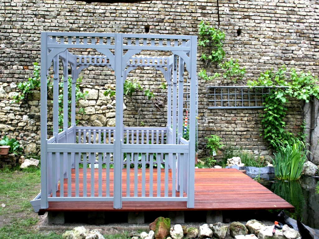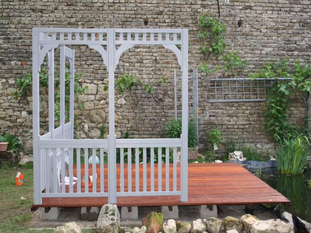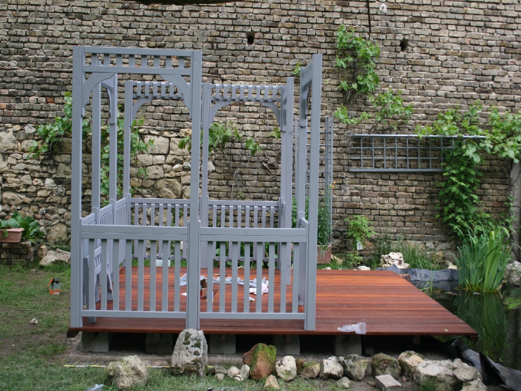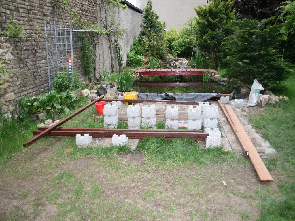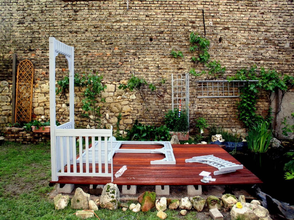 Der Grundaufbau steht. 5 Seitenteile und je 4 Geländerelemente, der Eingang wird zum Teich hin positioniert.