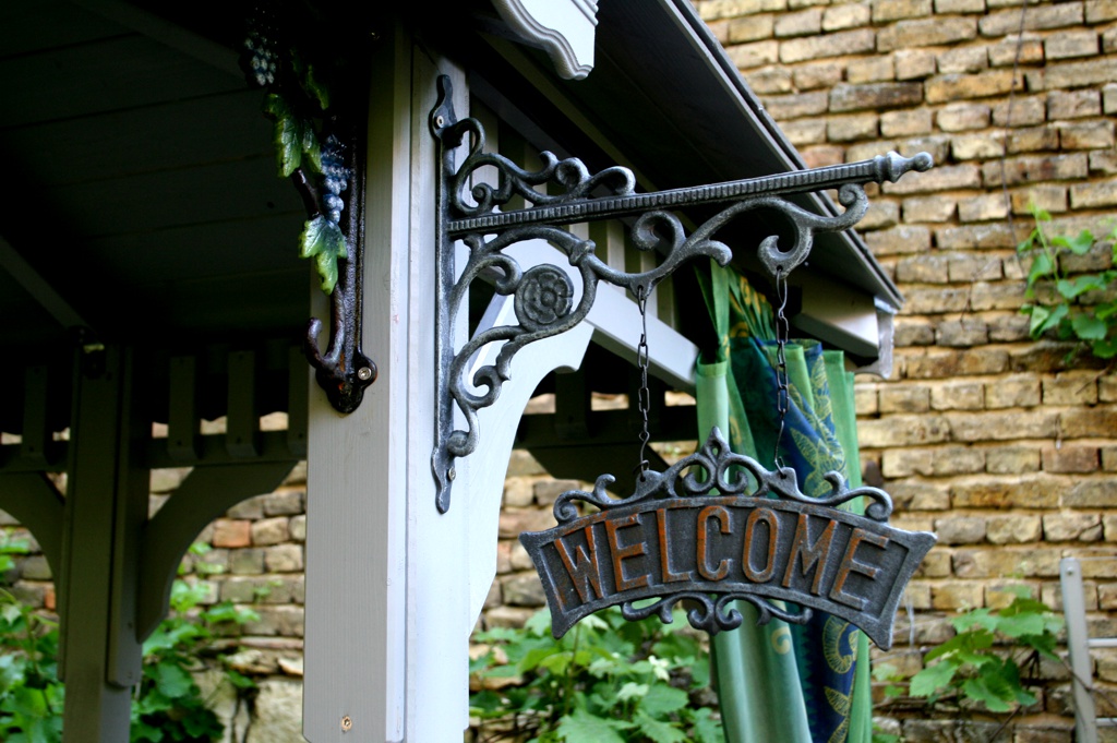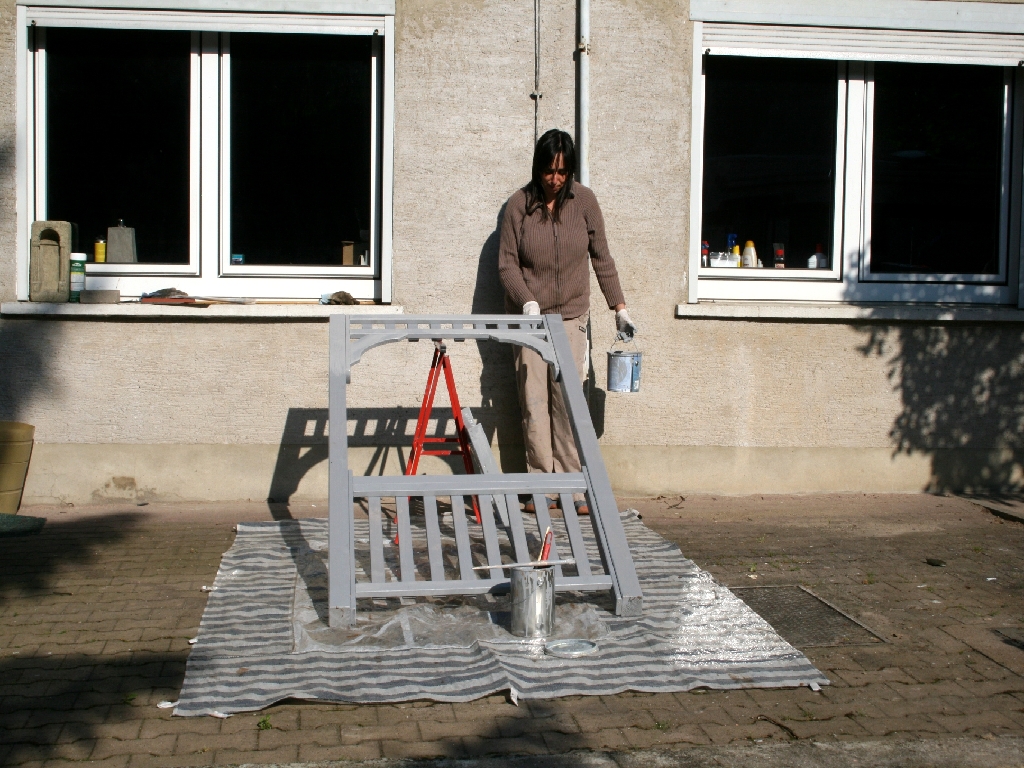 Die Grundfarbe ist Palatium-Grau, dazu kommen blaue und rote Farbanteile. Die Farbe soll den Garten und die Blumen nicht dominieren.