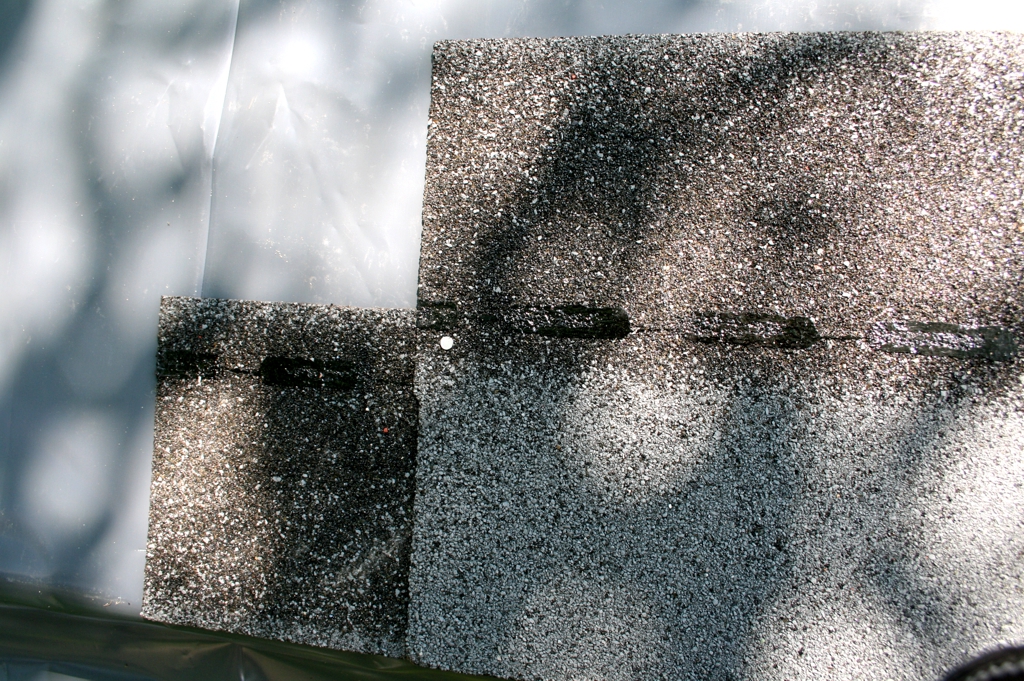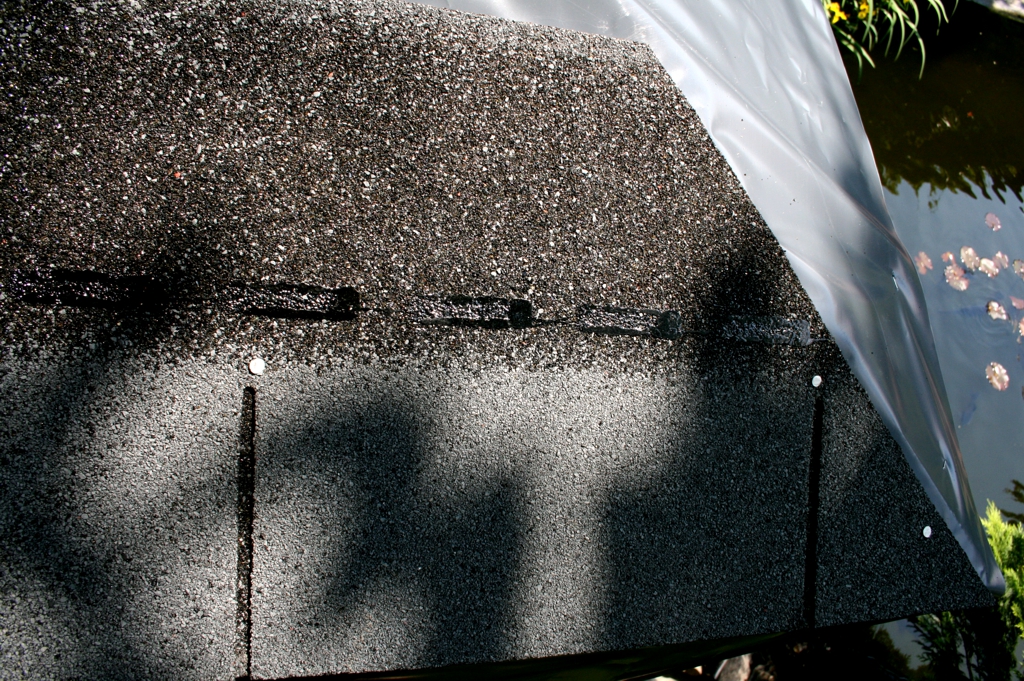 Für die unterste Reihe muß der obere Teil einer Schindelnreihe abgeschnitten werden. Darüber wird die zweite Reihe gelegt und mit Nägeln befestigt.