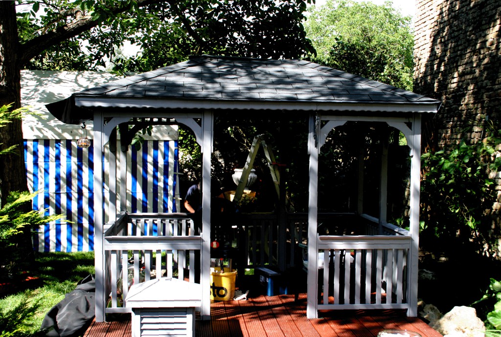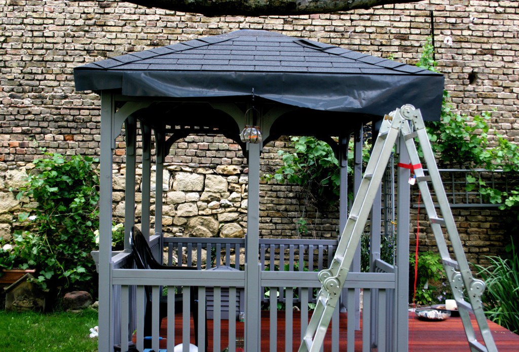 Wichtiger Moment: Der Pavillon paßt auf die Terrasse…