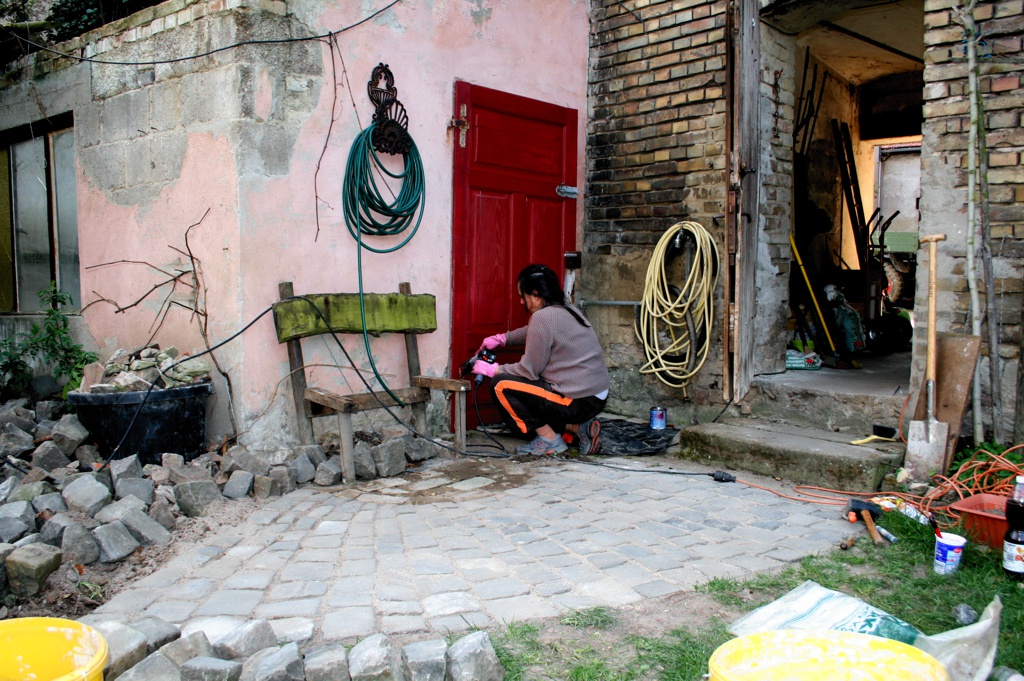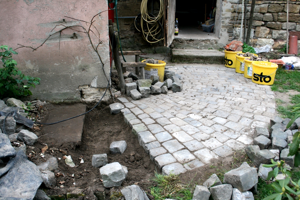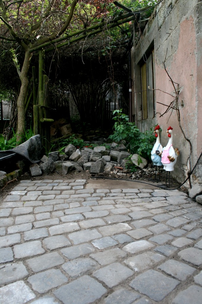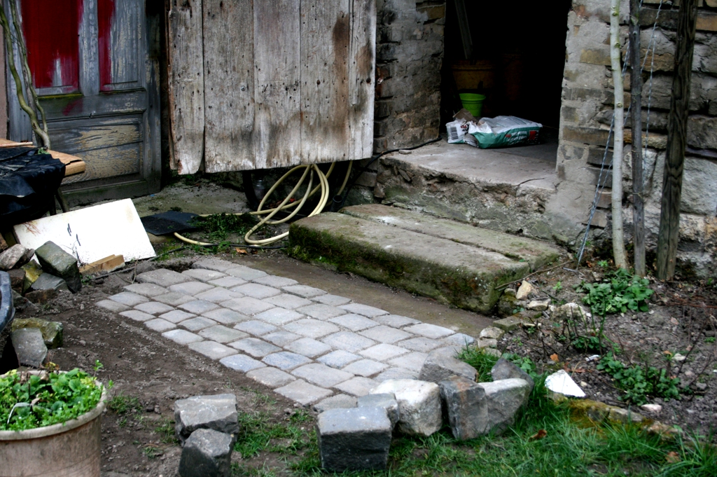 Der Eingang zum Garten wird als gepflasterte Promenade angelegt. Dazu wird altes historisches Pflaster wiederverwendet, das bei einer „Verschönerungsaktion“ eines Mitbürgers mit Migrationshintergrund profanen Knochensteinen weichen mußte.