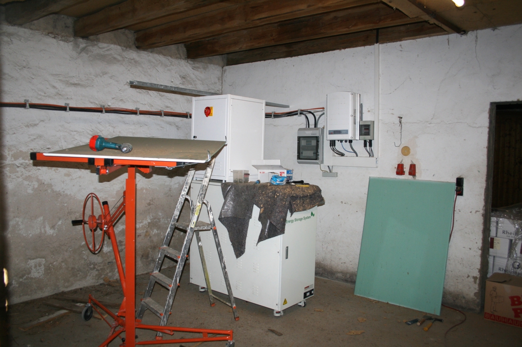 Das NEOSTORE Batteriesystem mit 10kWh Speicherkapazität liefert Strom, wenn die Sonne bereits untergegangen ist. Allerdings nur bis +5 Grad Celsius. Da das System in der Scheune untergebracht wurde, muß ein Raum drum herum, der beheizt werden kann.
